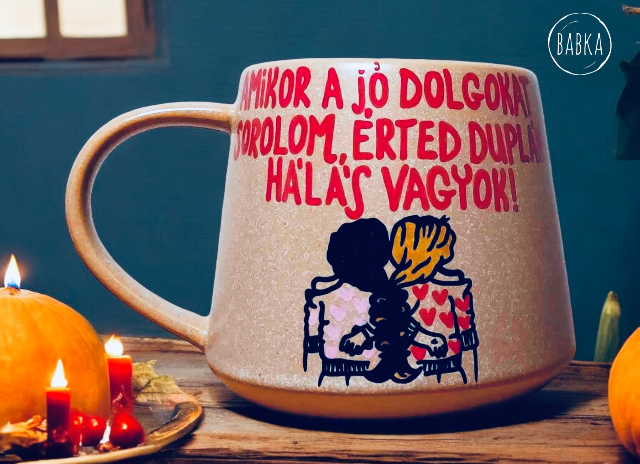 Kézzel festett egyedi termék. Néhány megjelölt termék kivételével soha nem használunk sablonokat, minden szabad kézzel zajlik. Kérheted különböző variációkban is, egyedi névre szóló feliratokkal, vagy a minta megváltoztatásával is, de tekinthetsz a termékre inspirációként, és megálmodhatsz egy teljesen rád szabott koncepciót. Több mint 800 saját termékünk van, tehát biztosan tudunk majd segíteni. :) Összeállíthatsz saját szetteket is természetesen. Ha nehezen igazodsz el a rengeteg kerámia és porcelán között, akkor ne érezd magad kellemetlenül, ha írsz nekünk! 😊 Mi is elveszünk néha sok mintában, természetes dolog, ha kérdezni szeretnél. A termékeket kézzel festjük, szárítjuk, hőkezeljük, ami időigényes folyamat, de ennek ellenére a 24 órás express kiszállításnak hála a legtöbb esetben 3-4 nap alatt meg is kapod a kiválasztott darabokat. A maximum kiszállítási időnk 10 munkanap, de ez ritkán fordul elő, és általában akkor, ha sok darabból álló teljesen egyedi kivitelezést kérsz. Ha nagyon sietned kell, akkor válaszd az SOS kiszállítást, mint feláras szolgáltatást. Ha SOS kiszállítást kérsz, akkor minden más munkát félreteszünk, és azonnal nekilátunk a tiédnek, hogy 1-3 nap alatt megkapd. Tipp: Ha nagyon sürgős, akkor írj nekünk messengeren, ahol gyorsan egyeztethetjüka részleteket, és igyekszünk segíteni, hogy az ajándékozás jól sikerüljön. A termékekhez kérhetsz extrákait, mint díszcsomagolást, a tányérokhoz fali akasztót vagy állványt (Bögrék esetében, ha az állvány opciót bejelölöd, akkor egy fém akasztó kampót teszünk a csomagba.), üdvözlő kártyát, ami egy egyedileg szövegezhető, tartós alumínium kártya (nem papír). Ha bármilyen probléma lenne a rendeléseddel, akkor írj nekünk mielőbb. Fontos tudnod, hogy soha és semmilyen esetben nem érhet kár nálunk! Írj nekünk emailt a hello@babkamanufaktura.hu email címre, és maximum néhány nap alatt releváns választ adunk. Ha sürgős, akkor pedig válaszd a messengert! Ha nagyobb mennyiséget rendelnél viszonteladásra, rendezvényre, tudunk adni egyedi árajánlatot (min. 20 darab tétel előre kifizetett megrendelésétől). Számos kávézó, cukrászda, esküvő, céges buli lett egy kicsit emelkedettebb a Babka termékeitől. Bár kézenfekvő lenne, hogy emailben jelzed az igényt, mégis válaszd inkább ez esetben is a messengert, mert sokkal dinamikusabban tudunk ott egyeztetni. Figyelj, hogy jelentkezz be az üzenet küldésénél, és ne vendégként írj, mert az elveszhet. Nézz körül az oldalon! Bármilyen kérdés, kérés esetén, írj Babkának az oldalon található messenger ikon segítségével, vagy a megadott egyéb csatornák egyikén. Ne feledd! A Babkával átadott üzenetekre még évekig emlékezni fognak, és érezni fogják, hogy időt is, kreativitást is áldoztál rájuk. Nem csak letudtad a „feladatot” egy sablonos megoldással. Köszönjük, hogy itt vagy! Jó válogatást, tervezést kívánunk!