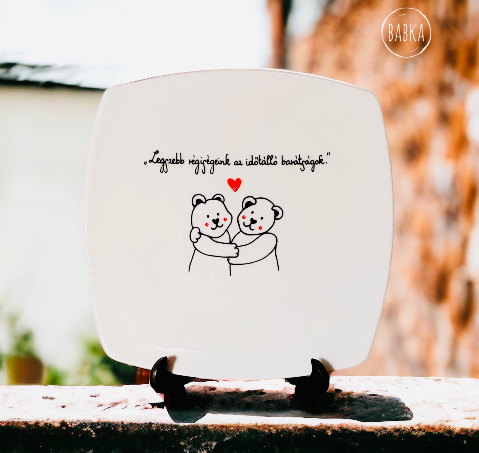 Kézzel festett egyedi termék. Néhány megjelölt termék kivételével soha nem használunk sablonokat, minden szabad kézzel zajlik. Kérheted különböző variációkban is, egyedi névre szóló feliratokkal, vagy a minta megváltoztatásával is, de tekinthetsz a termékre inspirációként, és megálmodhatsz egy teljesen rád szabott koncepciót. Több mint 800 saját termékünk van, tehát biztosan tudunk majd segíteni. :) Összeállíthatsz saját szetteket is természetesen. Ha nehezen igazodsz el a rengeteg kerámia és porcelán között, akkor ne érezd magad kellemetlenül, ha írsz nekünk! 😊 Mi is elveszünk néha sok mintában, természetes dolog, ha kérdezni szeretnél. A termékeket kézzel festjük, szárítjuk, hőkezeljük, ami időigényes folyamat, de ennek ellenére a 24 órás express kiszállításnak hála a legtöbb esetben 3-4 nap alatt meg is kapod a kiválasztott darabokat. A maximum kiszállítási időnk 10 munkanap, de ez ritkán fordul elő, és általában akkor, ha sok darabból álló teljesen egyedi kivitelezést kérsz. Ha nagyon sietned kell, akkor válaszd az SOS kiszállítást, mint feláras szolgáltatást. Ha SOS kiszállítást kérsz, akkor minden más munkát félreteszünk, és azonnal nekilátunk a tiédnek, hogy 1-3 nap alatt megkapd. Tipp: Ha nagyon sürgős, akkor írj nekünk messengeren, ahol gyorsan egyeztethetjüka részleteket, és igyekszünk segíteni, hogy az ajándékozás jól sikerüljön. A termékekhez kérhetsz extrákait, mint díszcsomagolást, a tányérokhoz fali akasztót vagy állványt (Bögrék esetében, ha az állvány opciót bejelölöd, akkor egy fém akasztó kampót teszünk a csomagba.), üdvözlő kártyát, ami egy egyedileg szövegezhető, tartós alumínium kártya (nem papír). Ha bármilyen probléma lenne a rendeléseddel, akkor írj nekünk mielőbb. Fontos tudnod, hogy soha és semmilyen esetben nem érhet kár nálunk! Írj nekünk emailt a hello@babkamanufaktura.hu email címre, és maximum néhány nap alatt releváns választ adunk. Ha sürgős, akkor pedig válaszd a messengert! Ha nagyobb mennyiséget rendelnél viszonteladásra, rendezvényre, tudunk adni egyedi árajánlatot (min. 20 darab tétel előre kifizetett megrendelésétől). Számos kávézó, cukrászda, esküvő, céges buli lett egy kicsit emelkedettebb a Babka termékeitől. Bár kézenfekvő lenne, hogy emailben jelzed az igényt, mégis válaszd inkább ez esetben is a messengert, mert sokkal dinamikusabban tudunk ott egyeztetni. Figyelj, hogy jelentkezz be az üzenet küldésénél, és ne vendégként írj, mert az elveszhet. Nézz körül az oldalon! Bármilyen kérdés, kérés esetén, írj Babkának az oldalon található messenger ikon segítségével, vagy a megadott egyéb csatornák egyikén. Ne feledd! A Babkával átadott üzenetekre még évekig emlékezni fognak, és érezni fogják, hogy időt is, kreativitást is áldoztál rájuk. Nem csak letudtad a „feladatot” egy sablonos megoldással. Köszönjük, hogy itt vagy! Jó válogatást, tervezést kívánunk!