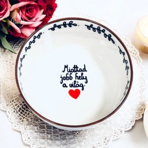 Kézzel festett termék. Egyedi, soha nem készül kettő pontosan egyforma. Néhány megjelölt termék kivételével soha nem használunk sablonokat, minden szabad kézzel zajlik. Kérheted különböző variációkban is, egyedi névre szóló feliratokkal, vagy a minta megváltoztatásával is, de tekinthetsz a termékre inspirációként, és megálmodhatsz egy teljesen rád szabott koncepciót. Több mint 800 saját termékünk van, tehát biztosan tudunk majd segíteni. :) Összeállíthatsz saját szetteket is természetesen. Ha nehezen igazodsz el a rengeteg kerámia és porcelán között, akkor ne érezd magad kellemetlenül, ha írsz nekünk! 😊 Mi is elveszünk néha sok mintában, természetes dolog, ha kérdezni szeretnél. A termékeket kézzel festjük, szárítjuk, hőkezeljük, ami időigényes folyamat, de ennek ellenére a 24 órás expressz kiszállításnak hála a legtöbb esetben 3-4 nap alatt meg is kapod a kiválasztott darabokat. A maximum kiszállítási időnk 10 munkanap, de ez ritkán fordul elő, és általában akkor, ha sok darabból álló teljesen egyedi kivitelezést kérsz. Ha nagyon sietned kell, akkor válaszd az SOS kiszállítást, mint feláras szolgáltatást. Ha SOS kiszállítást kérsz, akkor minden más munkát félreteszünk, és azonnal nekilátunk a tiédnek, hogy 1-3 nap alatt megkapd. Tipp: Ha nagyon sürgős, akkor írj nekünk messengeren, ahol gyorsan egyeztethetjük a részleteket, és igyekszünk segíteni, hogy az ajándékozás jól sikerüljön. A termékekhez kérhetsz extrákat, mint díszcsomagolást, a tányérokhoz fali akasztót vagy állványt (Bögrék esetében, ha az állvány opciót bejelölöd, akkor egy fém akasztó kampót teszünk a csomagba.), üdvözlő kártyát, ami egy egyedileg szövegezhető, tartós alumínium kártya (nem papír). Ha bármilyen probléma lenne a rendeléseddel, akkor írj nekünk mielőbb. Fontos tudnod, hogy soha és semmilyen esetben nem érhet kár nálunk! Írj nekünk emailt a hello@babkamanufaktura.hu email címre, és maximum néhány nap alatt releváns választ adunk. Ha sürgős, akkor pedig válaszd a messengert! Ha nagyobb mennyiséget rendelnél viszonteladásra, rendezvényre, tudunk adni egyedi árajánlatot (min. 20 darab tétel előre kifizetett megrendelésétől). Számos kávézó, cukrászda, esküvő, céges buli lett egy kicsit emelkedettebb a Babka termékeitől. Bár kézenfekvő lenne, hogy emailben jelzed az igényt, mégis válaszd inkább ez esetben is a messengert, mert sokkal dinamikusabban tudunk ott egyeztetni. Figyelj, hogy jelentkezz be az üzenet küldésénél, és ne vendégként írj, mert az elveszhet. Nézz körül az oldalon! Bármilyen kérdés, kérés esetén, írj Babkának az oldalon található messenger ikon segítségével, vagy a megadott egyéb csatornák egyikén. Ne feledd! A Babkával átadott üzenetekre még évekig emlékezni fognak, és érezni fogják, hogy időt is, kreativitást is áldoztál rájuk. Nem csak letudtad a „feladatot” egy sablonos megoldással. Köszönjük, hogy itt vagy! Jó válogatást, tervezést kívánunk!