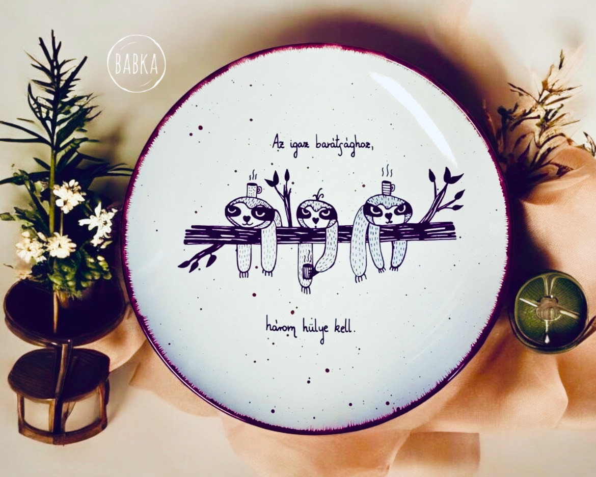 Kézzel festett egyedi termék. Néhány megjelölt termék kivételével soha nem használunk sablonokat, minden szabad kézzel zajlik. Kérheted különböző variációkban is, egyedi névre szóló feliratokkal, vagy a minta megváltoztatásával is, de tekinthetsz a termékre inspirációként, és megálmodhatsz egy teljesen rád szabott koncepciót. Több mint 800 saját termékünk van, tehát biztosan tudunk majd segíteni. 🙂 Összeállíthatsz saját szetteket is természetesen. Ha nehezen igazodsz el a rengeteg kerámia és porcelán között, akkor ne érezd magad kellemetlenül, ha írsz nekünk! 😊 Mi is elveszünk néha sok mintában, természetes dolog, ha kérdezni szeretnél. A termékeket kézzel festjük, szárítjuk, hőkezeljük, ami időigényes folyamat, de ennek ellenére a 24 órás express kiszállításnak hála a legtöbb esetben 3-4 nap alatt meg is kapod a kiválasztott darabokat. A maximum kiszállítási időnk 10 munkanap, de ez ritkán fordul elő, és általában akkor, ha sok darabból álló teljesen egyedi kivitelezést kérsz. Ha nagyon sietned kell, akkor válaszd az SOS kiszállítást, mint feláras szolgáltatást. Ha SOS kiszállítást kérsz, akkor minden más munkát félreteszünk, és azonnal nekilátunk a tiédnek, hogy 1-3 nap alatt megkapd. Tipp: Ha nagyon sürgős, akkor írj nekünk messengeren, ahol gyorsan egyeztethetjüka részleteket, és igyekszünk segíteni, hogy az ajándékozás jól sikerüljön. A termékekhez kérhetsz extrákait, mint díszcsomagolást, a tányérokhoz fali akasztót vagy állványt (Bögrék esetében, ha az állvány opciót bejelölöd, akkor egy fém akasztó kampót teszünk a csomagba.), üdvözlő kártyát, ami egy egyedileg szövegezhető, tartós alumínium kártya (nem papír). Ha bármilyen probléma lenne a rendeléseddel, akkor írj nekünk mielőbb. Fontos tudnod, hogy soha és semmilyen esetben nem érhet kár nálunk! Írj nekünk emailt a hello@babkamanufaktura.hu email címre, és maximum néhány nap alatt releváns választ adunk. Ha sürgős, akkor pedig válaszd a messengert! Ha nagyobb mennyiséget rendelnél viszonteladásra, rendezvényre, tudunk adni egyedi árajánlatot (min. 20 darab tétel előre kifizetett megrendelésétől). Számos kávézó, cukrászda, esküvő, céges buli lett egy kicsit emelkedettebb a Babka termékeitől. Bár kézenfekvő lenne, hogy emailben jelzed az igényt, mégis válaszd inkább ez esetben is a messengert, mert sokkal dinamikusabban tudunk ott egyeztetni. Figyelj, hogy jelentkezz be az üzenet küldésénél, és ne vendégként írj, mert az elveszhet. Nézz körül az oldalon! Bármilyen kérdés, kérés esetén, írj Babkának az oldalon található messenger ikon segítségével, vagy a megadott egyéb csatornák egyikén. Ne feledd! A Babkával átadott üzenetekre még évekig emlékezni fognak, és érezni fogják, hogy időt is, kreativitást is áldoztál rájuk. Nem csak letudtad a „feladatot” egy sablonos megoldással. Köszönjük, hogy itt vagy! Jó válogatást, tervezést kívánunk!