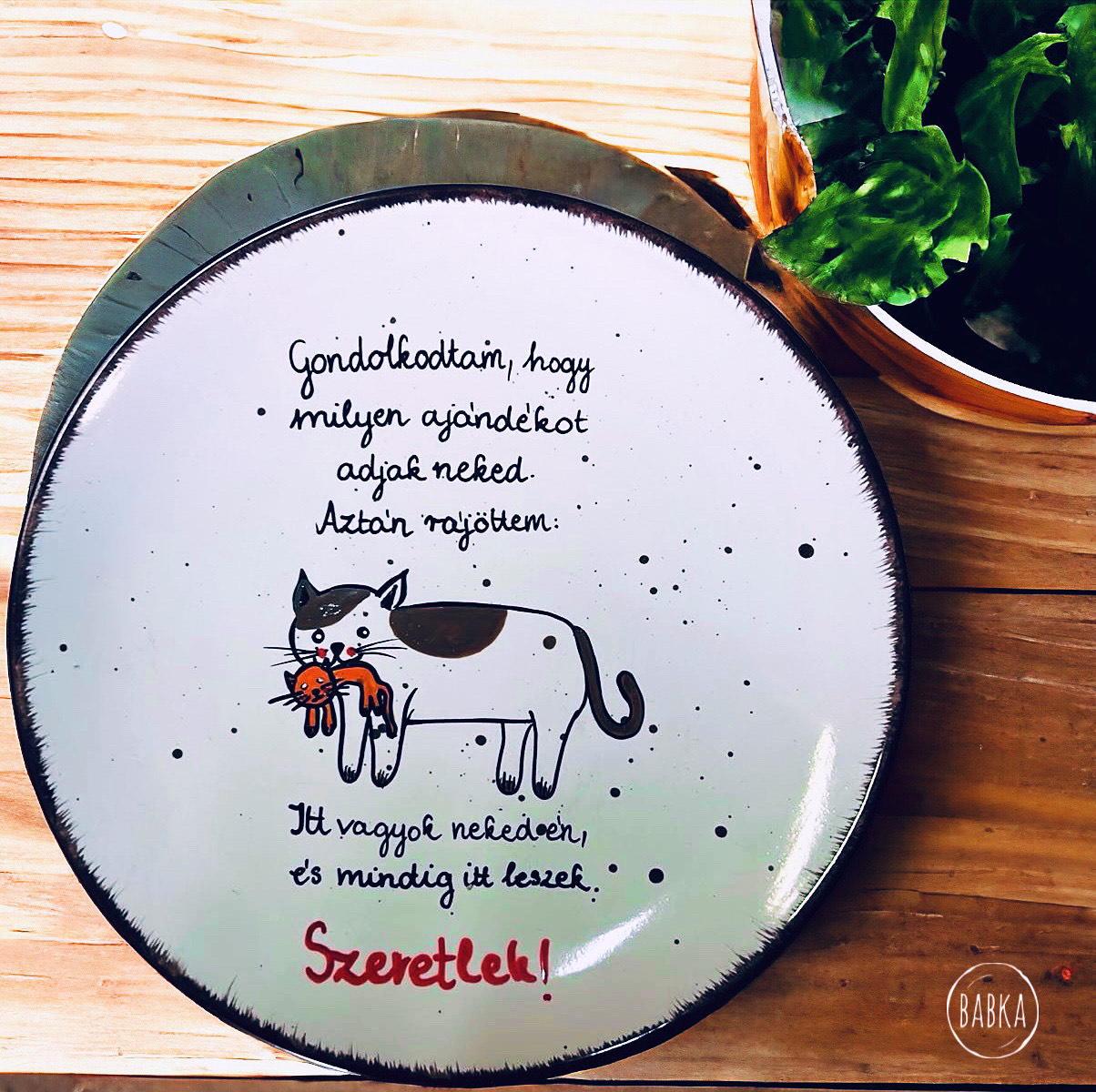 Kézzel festett, egyedi termék. Néhány megjelölt termék kivételével soha nem használunk sablonokat, minden szabad kézzel zajlik. Kérheted különböző variációkban is, egyedi névre szóló feliratokkal, vagy a minta megváltoztatásával is, de tekinthetsz a termékre inspirációként, és megálmodhatsz egy teljesen rád szabott koncepciót. Több mint 800 saját termékünk van, tehát biztosan tudunk majd segíteni. :) Összeállíthatsz saját szetteket is természetesen. Ha nehezen igazodsz el a rengeteg kerámia és porcelán között, akkor ne érezd magad kellemetlenül, ha írsz nekünk! 😊 Mi is elveszünk néha sok mintában, természetes dolog, ha kérdezni szeretnél. A termékeket kézzel festjük, szárítjuk, hőkezeljük, ami időigényes folyamat, de ennek ellenére a 24 órás expressz kiszállításnak hála a legtöbb esetben 3-4 nap alatt meg is kapod a kiválasztott darabokat. A maximum kiszállítási időnk 10 munkanap, de ez ritkán fordul elő, és általában akkor, ha sok darabból álló teljesen egyedi kivitelezést kérsz. Ha nagyon sietned kell, akkor válaszd az SOS kiszállítást, mint feláras szolgáltatást. Ha SOS kiszállítást kérsz, akkor minden más munkát félreteszünk, és azonnal nekilátunk a tiédnek, hogy 1-3 nap alatt megkapd. Tipp: Ha nagyon sürgős, akkor írj nekünk messengeren, ahol gyorsan egyeztethetjük a részleteket, és igyekszünk segíteni, hogy az ajándékozás jól sikerüljön. A termékekhez kérhetsz extrákat, mint díszcsomagolást, a tányérokhoz fali akasztót vagy állványt (Bögrék esetében, ha az állvány opciót bejelölöd, akkor egy fém akasztó kampót teszünk a csomagba.), üdvözlő kártyát, ami egy egyedileg szövegezhető, tartós alumínium kártya (nem papír). Ha bármilyen probléma lenne a rendeléseddel, akkor írj nekünk mielőbb. Fontos tudnod, hogy soha és semmilyen esetben nem érhet kár nálunk! Írj nekünk emailt a hello@babkamanufaktura.hu email címre, és maximum néhány nap alatt releváns választ adunk. Ha sürgős, akkor pedig válaszd a messengert! Ha nagyobb mennyiséget rendelnél viszonteladásra, rendezvényre, tudunk adni egyedi árajánlatot (min. 20 darab tétel előre kifizetett megrendelésétől). Számos kávézó, cukrászda, esküvő, céges buli lett egy kicsit emelkedettebb a Babka termékeitől. Bár kézenfekvő lenne, hogy emailben jelzed az igényt, mégis válaszd inkább ez esetben is a messengert, mert sokkal dinamikusabban tudunk ott egyeztetni. Figyelj, hogy jelentkezz be az üzenet küldésénél, és ne vendégként írj, mert az elveszhet. Nézz körül az oldalon! Bármilyen kérdés, kérés esetén, írj Babkának az oldalon található messenger ikon segítségével, vagy a megadott egyéb csatornák egyikén. (Minden egyéb kérdés tekintetében megtalálod oldalunkon ÁSZF-ünket is.) Ne feledd! A Babkával átadott üzenetekre még évekig emlékezni fognak, és érezni fogják, hogy időt is, kreativitást is áldoztál rájuk. Nem csak letudtad a „feladatot” egy sablonos megoldással. Köszönjük, hogy itt vagy! Jó válogatást, tervezést kívánunk!