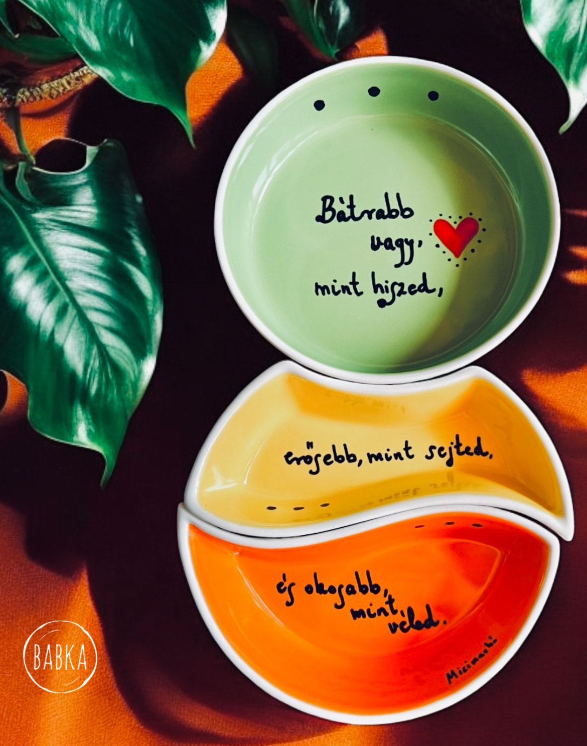 Kézzel festett, egyedi termék. Néhány megjelölt termék kivételével soha nem használunk sablonokat, minden szabad kézzel zajlik. Kérheted különböző variációkban is, egyedi névre szóló feliratokkal, vagy a minta megváltoztatásával is, de tekinthetsz a termékre inspirációként, és megálmodhatsz egy teljesen rád szabott koncepciót. Több mint 800 saját termékünk van, tehát biztosan tudunk majd segíteni. :) Összeállíthatsz saját szetteket is természetesen. Ha nehezen igazodsz el a rengeteg kerámia és porcelán között, akkor ne érezd magad kellemetlenül, ha írsz nekünk! 😊 Mi is elveszünk néha sok mintában, természetes dolog, ha kérdezni szeretnél. A termékeket kézzel festjük, szárítjuk, hőkezeljük, ami időigényes folyamat, de ennek ellenére a 24 órás expressz kiszállításnak hála a legtöbb esetben 3-4 nap alatt meg is kapod a kiválasztott darabokat. A maximum kiszállítási időnk 10 munkanap, de ez ritkán fordul elő, és általában akkor, ha sok darabból álló teljesen egyedi kivitelezést kérsz. Ha nagyon sietned kell, akkor válaszd az SOS kiszállítást, mint feláras szolgáltatást. Ha SOS kiszállítást kérsz, akkor minden más munkát félreteszünk, és azonnal nekilátunk a tiédnek, hogy 1-3 nap alatt megkapd. Tipp: Ha nagyon sürgős, akkor írj nekünk messengeren, ahol gyorsan egyeztethetjük a részleteket, és igyekszünk segíteni, hogy az ajándékozás jól sikerüljön. A termékekhez kérhetsz extrákat, mint díszcsomagolást, a tányérokhoz fali akasztót vagy állványt (Bögrék esetében, ha az állvány opciót bejelölöd, akkor egy fém akasztó kampót teszünk a csomagba.), üdvözlő kártyát, ami egy egyedileg szövegezhető, tartós alumínium kártya (nem papír). Ha bármilyen probléma lenne a rendeléseddel, akkor írj nekünk mielőbb. Fontos tudnod, hogy soha és semmilyen esetben nem érhet kár nálunk! Írj nekünk emailt a hello@babkamanufaktura.hu email címre, és maximum néhány nap alatt releváns választ adunk. Ha sürgős, akkor pedig válaszd a messengert! Ha nagyobb mennyiséget rendelnél viszonteladásra, rendezvényre, tudunk adni egyedi árajánlatot (min. 20 darab tétel előre kifizetett megrendelésétől). Számos kávézó, cukrászda, esküvő, céges buli lett egy kicsit emelkedettebb a Babka termékeitől. Bár kézenfekvő lenne, hogy emailben jelzed az igényt, mégis válaszd inkább ez esetben is a messengert, mert sokkal dinamikusabban tudunk ott egyeztetni. Figyelj, hogy jelentkezz be az üzenet küldésénél, és ne vendégként írj, mert az elveszhet. Nézz körül az oldalon! Bármilyen kérdés, kérés esetén, írj Babkának az oldalon található messenger ikon segítségével, vagy a megadott egyéb csatornák egyikén. (Minden egyéb kérdés tekintetében megtalálod oldalunkon ÁSZF-ünket is.) Ne feledd! A Babkával átadott üzenetekre még évekig emlékezni fognak, és érezni fogják, hogy időt is, kreativitást is áldoztál rájuk. Nem csak letudtad a „feladatot” egy sablonos megoldással. Köszönjük, hogy itt vagy! Jó válogatást, tervezést kívánunk!