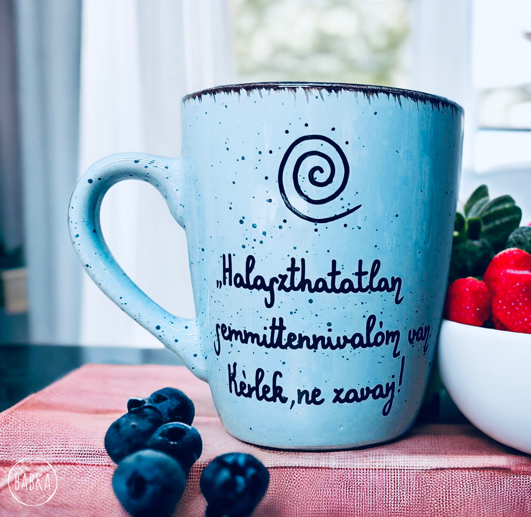 Kézzel festett, egyedi termék. Néhány megjelölt termék kivételével soha nem használunk sablonokat, minden szabad kézzel zajlik. Kérheted különböző variációkban is, egyedi névre szóló feliratokkal, vagy a minta megváltoztatásával is, de tekinthetsz a termékre inspirációként, és megálmodhatsz egy teljesen rád szabott koncepciót. Több mint 800 saját termékünk van, tehát biztosan tudunk majd segíteni. :) Összeállíthatsz saját szetteket is természetesen. Ha nehezen igazodsz el a rengeteg kerámia és porcelán között, akkor ne érezd magad kellemetlenül, ha írsz nekünk! 😊 Mi is elveszünk néha sok mintában, természetes dolog, ha kérdezni szeretnél. A termékeket kézzel festjük, szárítjuk, hőkezeljük, ami időigényes folyamat, de ennek ellenére a 24 órás expressz kiszállításnak hála a legtöbb esetben 3-4 nap alatt meg is kapod a kiválasztott darabokat. A maximum kiszállítási időnk 10 munkanap, de ez ritkán fordul elő, és általában akkor, ha sok darabból álló teljesen egyedi kivitelezést kérsz. Ha nagyon sietned kell, akkor válaszd az SOS kiszállítást, mint feláras szolgáltatást. Ha SOS kiszállítást kérsz, akkor minden más munkát félreteszünk, és azonnal nekilátunk a tiédnek, hogy 1-3 nap alatt megkapd. Tipp: Ha nagyon sürgős, akkor írj nekünk messengeren, ahol gyorsan egyeztethetjük a részleteket, és igyekszünk segíteni, hogy az ajándékozás jól sikerüljön. A termékekhez kérhetsz extrákat, mint díszcsomagolást, a tányérokhoz fali akasztót vagy állványt (Bögrék esetében, ha az állvány opciót bejelölöd, akkor egy fém akasztó kampót teszünk a csomagba.), üdvözlő kártyát, ami egy egyedileg szövegezhető, tartós alumínium kártya (nem papír). Ha bármilyen probléma lenne a rendeléseddel, akkor írj nekünk mielőbb. Fontos tudnod, hogy soha és semmilyen esetben nem érhet kár nálunk! Írj nekünk emailt a hello@babkamanufaktura.hu email címre, és maximum néhány nap alatt releváns választ adunk. Ha sürgős, akkor pedig válaszd a messengert! Ha nagyobb mennyiséget rendelnél viszonteladásra, rendezvényre, tudunk adni egyedi árajánlatot (min. 20 darab tétel előre kifizetett megrendelésétől). Számos kávézó, cukrászda, esküvő, céges buli lett egy kicsit emelkedettebb a Babka termékeitől. Bár kézenfekvő lenne, hogy emailben jelzed az igényt, mégis válaszd inkább ez esetben is a messengert, mert sokkal dinamikusabban tudunk ott egyeztetni. Figyelj, hogy jelentkezz be az üzenet küldésénél, és ne vendégként írj, mert az elveszhet. Nézz körül az oldalon! Bármilyen kérdés, kérés esetén, írj Babkának az oldalon található messenger ikon segítségével, vagy a megadott egyéb csatornák egyikén. (Minden egyéb kérdés tekintetében megtalálod oldalunkon ÁSZF-ünket is.) Ne feledd! A Babkával átadott üzenetekre még évekig emlékezni fognak, és érezni fogják, hogy időt is, kreativitást is áldoztál rájuk. Nem csak letudtad a „feladatot” egy sablonos megoldással. Köszönjük, hogy itt vagy! Jó válogatást, tervezést kívánunk!